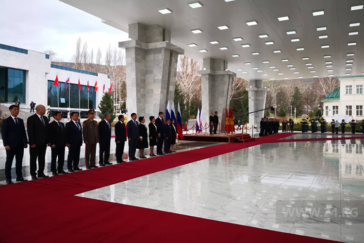 Эки мамлекеттин башчылары аянт менен басып, аларды Ардактуу кароол салам менен тосуп алышты. Анда эки өлкөнүн гимндери жаңырып турду. Орусиянын президенти гвардиячылар менен кыргыз тилинде учурашты.