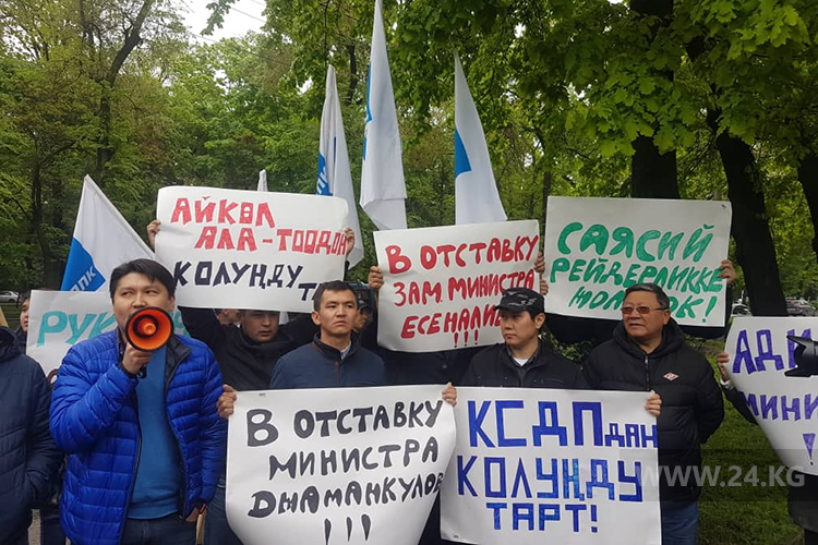 Буга чейин жарыяланган акцияга 20га жакын киши чогулду. Алардын пикиринде Адилет министрлиги мыйзамды бузууда. Сагынбек Абдрахмановду саясий рейдерликке айыптап, министр Марат Жаманкуловдон кызматтан кетүүнү талап кылышты.