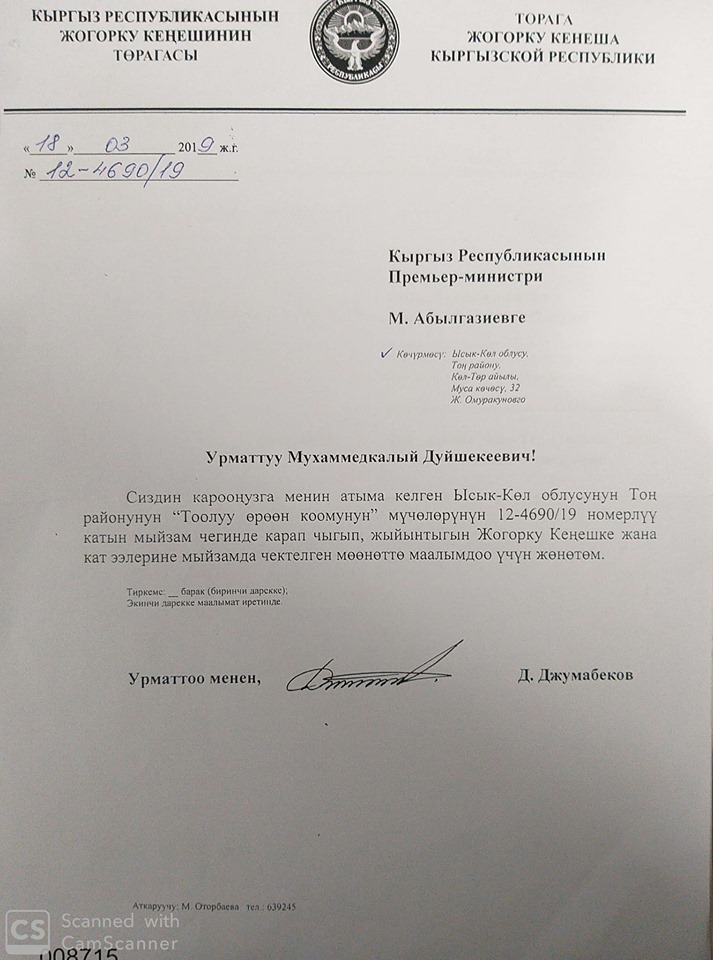 «Биз «Тоолуу өрөөн коому» коомдук бирикмеси 12-21612/18 номерлүү катын, Балыкчы-Бөкөнбаев-Тоң унаа жолдорун оңдоого каражат бөлүп берүү жагын сурандык элек. Урматтуу премьер-министр жооп берип койсоңуз, бир жыл болуп баратат. Эт жебесек да, шорпо ичкендей болуп калалык. Урматтуу Дастанбек Артисбекович сиз дагы кайрылып койсоңуз,Тоң эли күтүп жатат», — деп айтылат маалыматта.