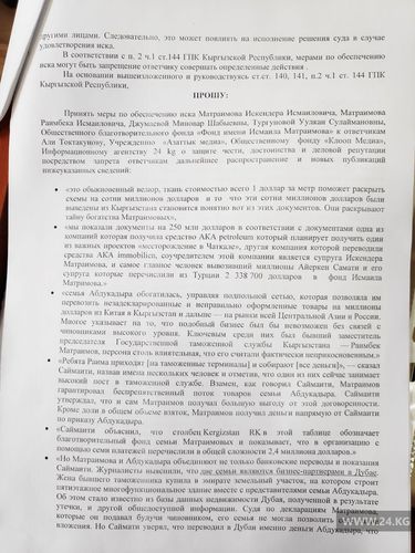 Доо арызда көрсөтүлгөндөй, Матраимовдордун үй-бүлөсүнүн пикиринде, бир канча фраза алардын намысына шек келтирүүдө. Мисалы, «Бир метри 1 доллар турган материал -кадимки велюр жүз миллион долларлык схемаларды ачууга жардам берет. Ошондой эле Кыргызстандан 100 миллион доллар чыгарылып кеткени уушул документтерден улам түшүнүктүү. Алар Матраимовдордун байлыктарынын сырын ачат», — деген сүйлөмдөр.