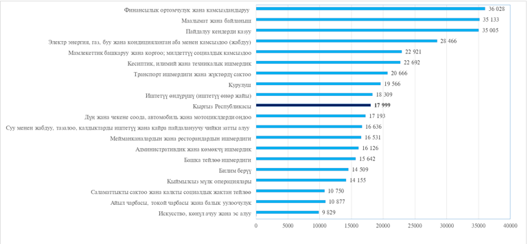 «Эң эле жогору орточо айлык акысы финансылык ортомчулук жана камсыздандыруу тармагынын кызматкерлеринде аныкталды — 36 миң 28 сом, маалымат жана байланыш тармагында — 35 миң 133 сом жана пайдалуу кен казуу тармагында — 35 миң 5 сомду түздү», — дейт Статком.