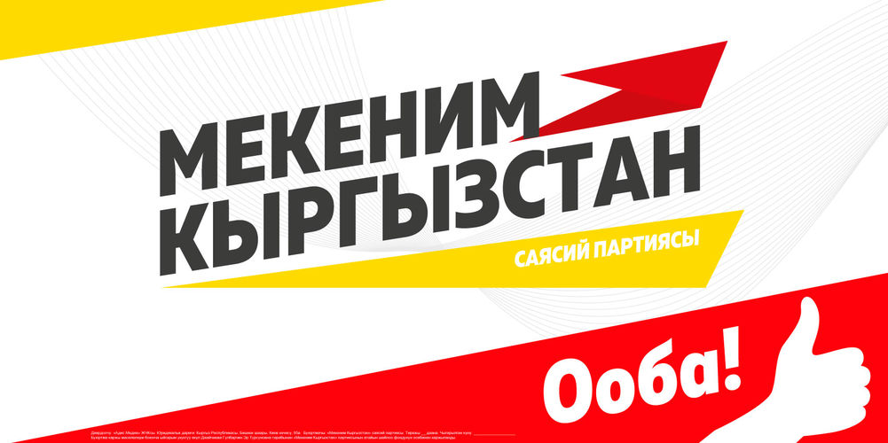 Буюртма каржы маселелери боюнча ыйгарым укуктуу өкүл Джайчиева Гулбарчин Эр Турсуновна тарабынан «Мекеним Кыргызстан» партиясынын атайын шайлоо фондунун эсебинен каржыланды. Юридикалык дареги: Кыргыз Республикасы, Бишкек шаары. Турусбеков көчөсү, 109/1. 510-кабинет.