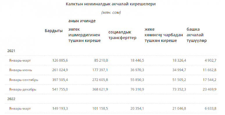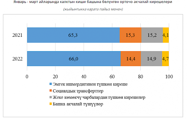 «Милдеттүү төлөмдөрдү жана мүчөлүк салымдарды чыгаруу менен кирешелерди мүнөздөгөн калктын киши башына алгандагы колдо болгон акчалай кирешелери 2022-жылдын I кварталында айына 7 420,1 сомду түздү жана өткөн жылдын тийиштүү мезгилине салыштырганда 15,5 пайызга өстү. Кирешенин эң чоң үлүшү (66 пайызды) жумуш менен камсыз болгон кирешеден түшкөн», — деп айтылат маалыматта.