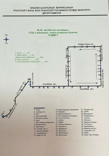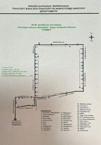 № 56 автобус Кожобергенов көчөсү менен Чоң-Арык айылына чейин барат. № 55 автобус Ахунбаев, Чортеков, Муромский, Селекционное көчөлөрү менен ЖЭБ-2ге чейин жүрөт.