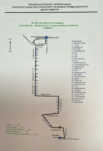 Ошондой эле № 226 автобустун каттамы мурдагы калыбына келтирилип, Ал Сухэ-Батор, Юнусалиев жана Медеров көчөлөрү менен каттайт.
