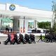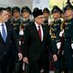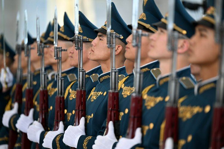 Ардак кароолдун ротасынын командиринин рапортунан кийин өлкө лидерлери тизилген катардын алдынан өтүп, өздөрүнүн расмий делегация мүчөлөрү менен тааныштырышты.