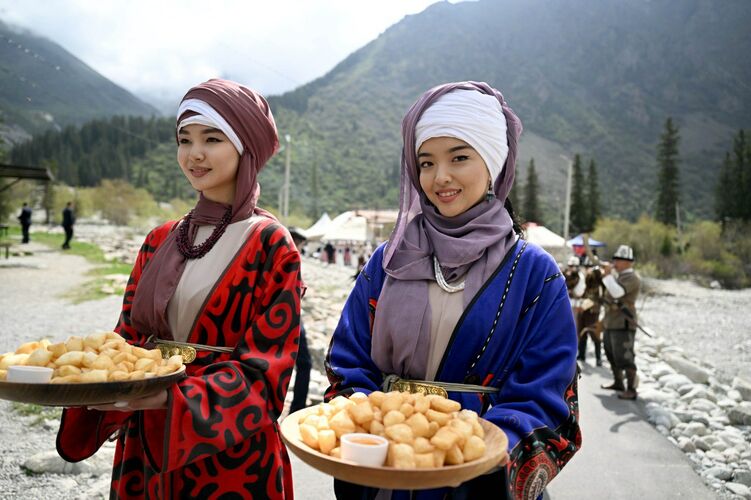 Өлкө лидерлерин төкмө акындар, «Алптар» баатырлары жана «Аталар изи» улуттук кийимчен кыздар тосуп алышты.
