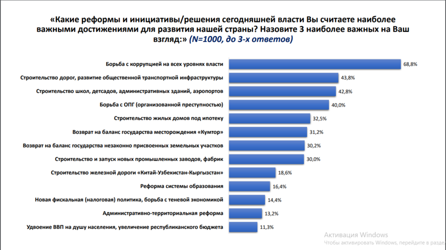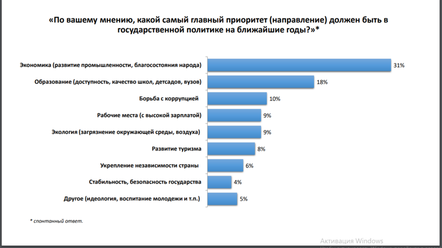 Сурамжылоого ылайык, респонденттердин басымдуу бөлүгү социалдык-экономикалык чөйрөдөгү оң өзгөрүүлөрдү белгилешти. Бул өкмөттүн жарандардын жашоо шартын жакшыртуу боюнча иш алып барып жатканын айгинелеп турат.