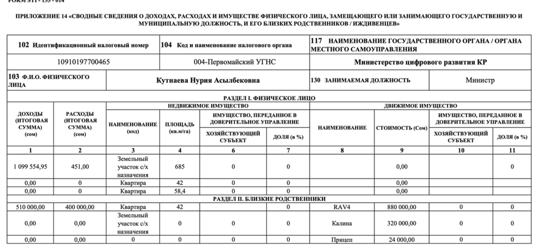 Салык кызматы мамлекеттик кызматкерлердин 2023-жылга кирешеси тууралуу декларациясын жарыялай баштады. Санариптик өнүктүрүү министри Нурия Кутнаеванын маалыматтары төмөндөгүчө билдирилди.