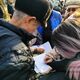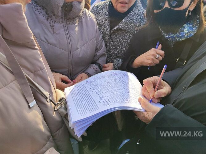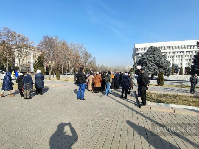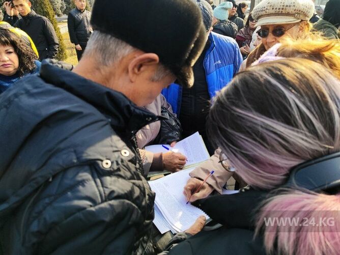 Жогорку Кеңештин имаратынын жанына 50дөй адам чогулуп, мамлекет башчыга кайрылуу үчүн каалоочулардын бардыгынан кол топтоп жатышат.
