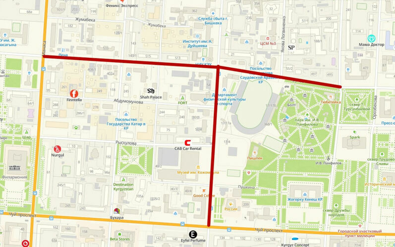 Саат 17.00дөн 23.00гө чейин Тоголок Молдо көчөсү Чүй проспектисинен Фрунзе көчөсүнө чейин унаалар үчүн жабылат. Фрунзе көчөсү Исанов көчөсүнөн Панфилов көчөсүнө чейин жабылат.