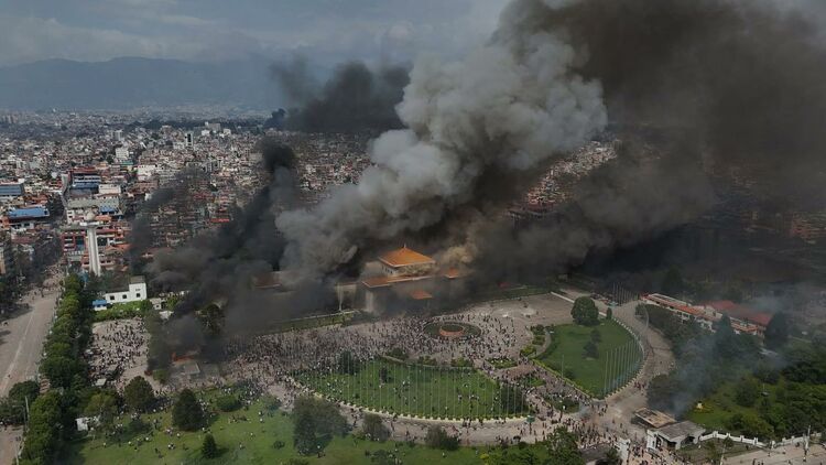 Сүрөттө Непал парламентинин имараты, анын алдына митингчилер чогулган. Социалдык тармактарга чектөө дүйнөлүк ири компаниялар өлкөнүн Байланыш министрлигинен каттоодон өтпөй калгандан кийин киргизилген.