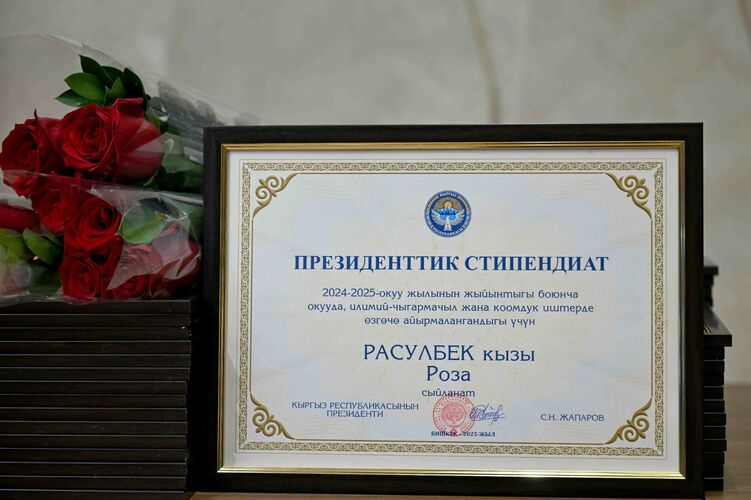 Президент Садыр Жапаров студенттерге ийгиликтерди жана жетишкендиктерди каалап, президенттик стипендияларды тапшырды.