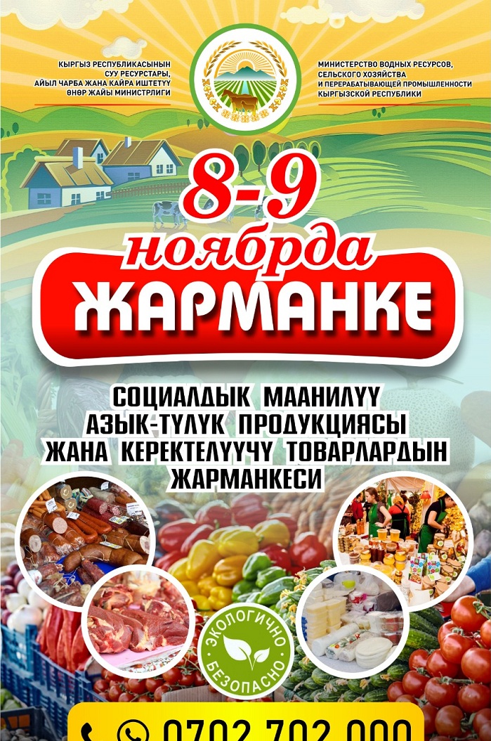 Бишкекте 8-9-ноябрда социалдык маанилүү продукцияларды сунуштаган жергиликтүү өндүрүүчүлөрдүн, дыйкандардын жана кол өнөрчүлөрдүн жарманкеси өтөт. Бул тууралуу Суу ресурстары, айыл чарба жана кайра иштетүү өнөр жайы министрлигинен билдиришти.