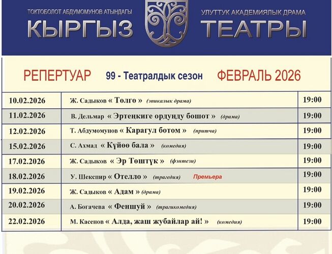 Кыргыз улуттук драма театрынын февраль айына карата репертуарын жарыялады.