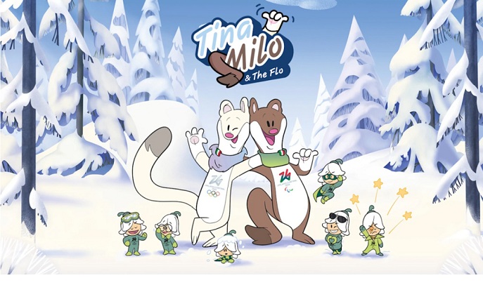 Тина мелдештин карлуу бөлүгүн, ал эми Мило тоолуу бөлүгүн билдирет. Бул дуэт турнирдин географиясын жана шаар менен тоолордун ортосундагы диалог идеясын баса белгилейт. Кара тору Мило Паралимпиада оюндарын билдирет. Ал бир буту жок жана куйругун колдонуп кыймылдайт. Талисмандардын достору да бар — кайра жаралууну символдоштурган Фло аттуу алты кар бүрчөгү.