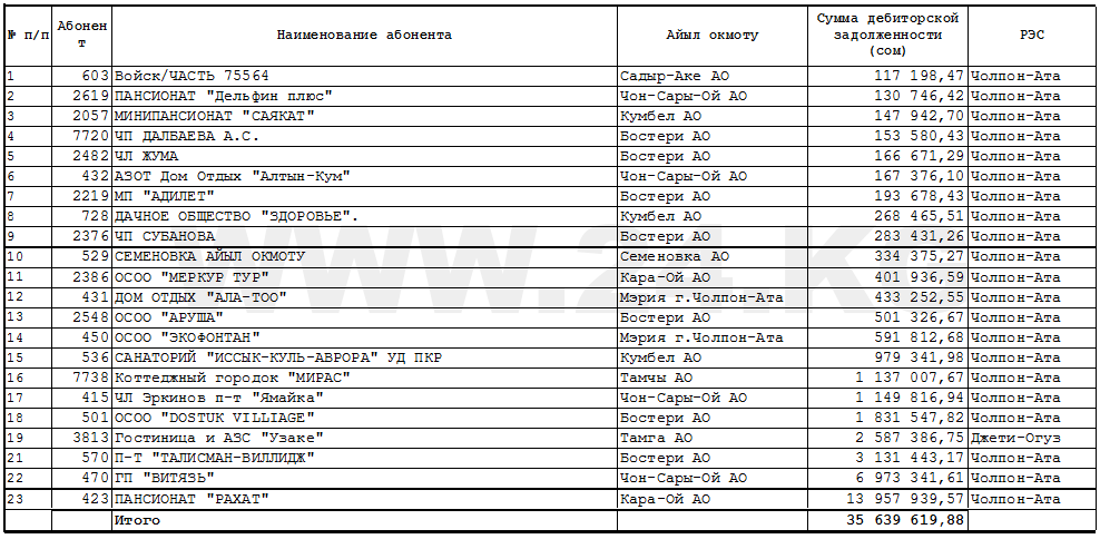 Алардын маалыматында, электр жарыгын төлөбөгөндөрдүн сап башында белгилүү эс алуу жайлары — «Талисман-Виллидж», «Витязь», «Рахат», «Алтын-Кум» жана «Ала-Тоо» турат.