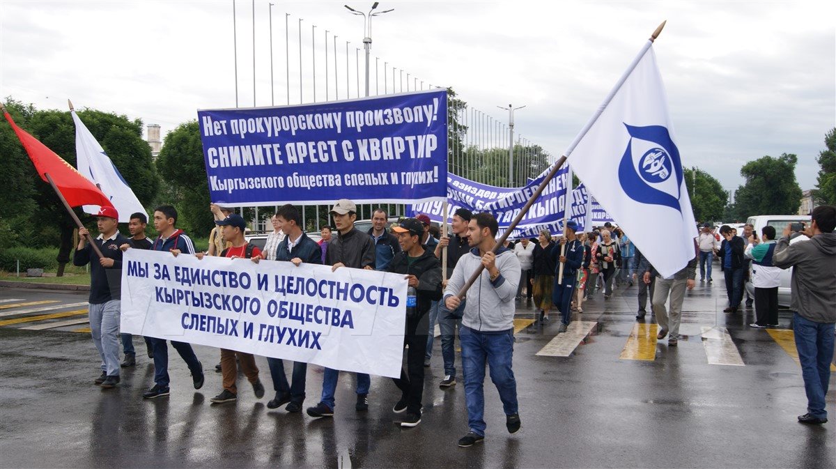 «Азиз жана дүлөйлөр коомунун биримдиги үчүн» акциясынын катышуучулары Ала-тоо аянтынан өтүп, жыйындарды өткөрүүгө уруксат берилген Горький сейил багына бет алышты.