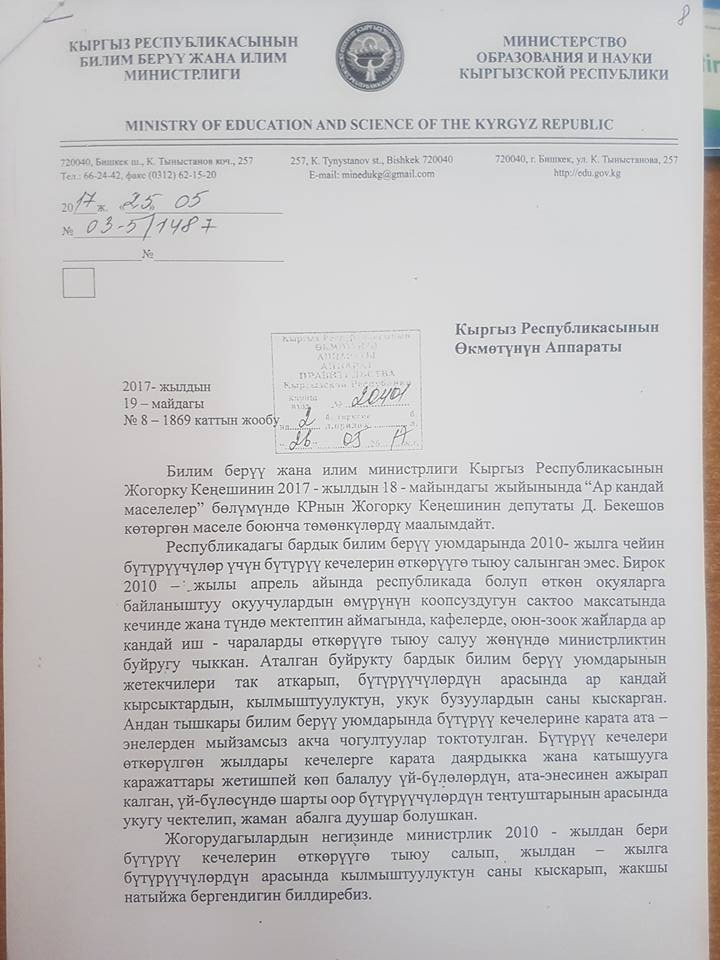 Эскерте кетсек, 18-майда Жогорку Кеңешдин депутаты Дастан Бекешев бүтүрүүчү кечелерге кайра расмий уруксат берүүнү сунуштаган. Депутаттын айтымында, министрликтин бул чечими кагаз жүзүндө калып, кечелер мурдакыдай эле мектеп, кафе-ресторандарда өткөрүлүп жатат.