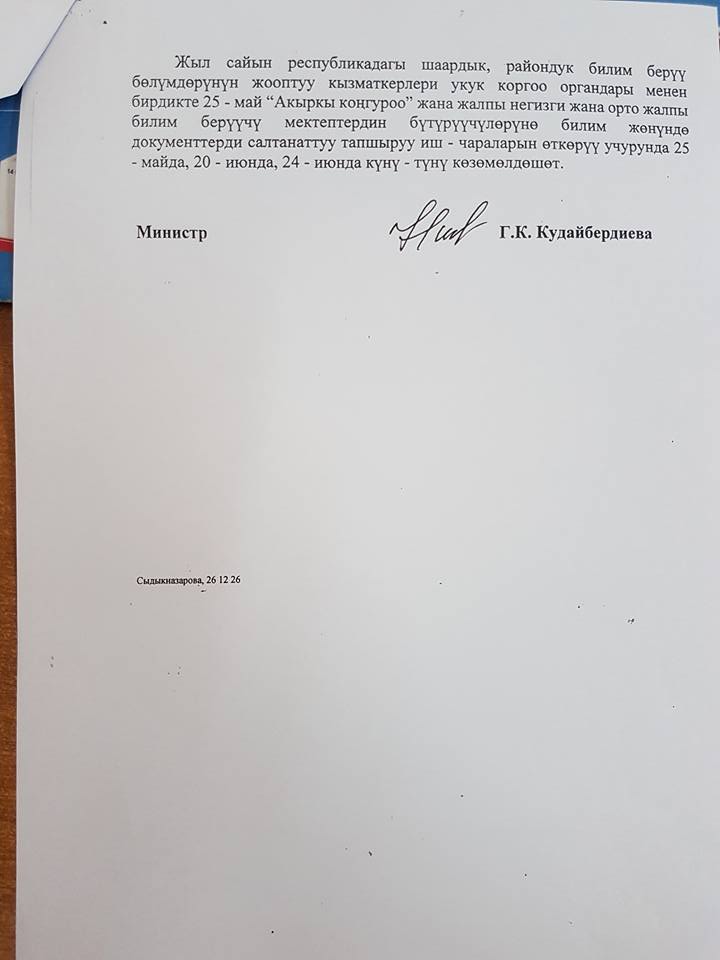 «Кечелерге акча төлөй албай калган балдар томсоруп, бөлүнүп, тышка калышчу. Бул алардын укугун бузуу болуп саналат. Жыл сайын 25-майда, 24-июнда шаардык, райондук билим берүү бөлүмдөрү текшерүү жүргүзүшөт. Буйрукту бузган мектеп жетекчилиги жоопко тартылат», — деп айтылат түшүндүрмөдө.
