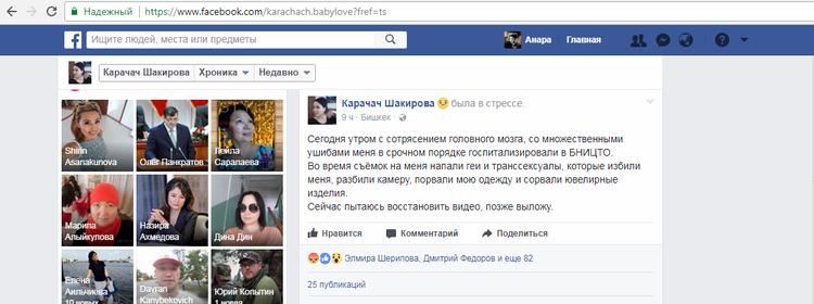 «Бүгүн эртең менен мени Бишкек шаарындагы Травмотология жана ортопедия илимий изилдөө борборуна жеткиришти. Мээм чайкалып, дене боюм көгөргөн. Видеого тартып жатка кезде мага транссексуалдар кол салып, камерамды сындырып, кийимди жыртып, зер буюмдарымды жулуп алышты», — дейт Карачач Шакирова.