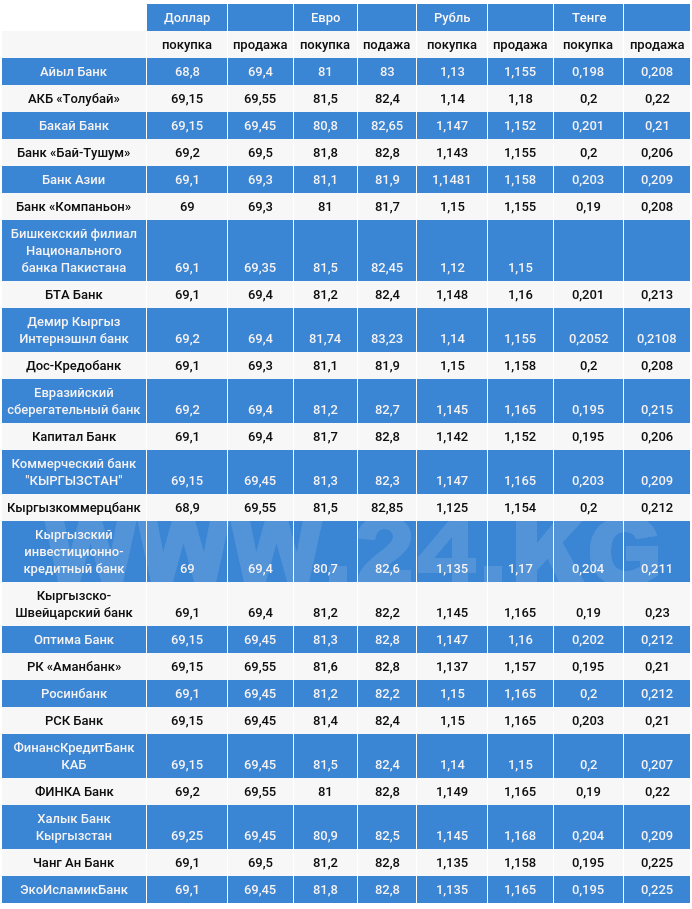 Валюталар курсу банктардан түшкөн маалыматка карата жаңыланып турат.