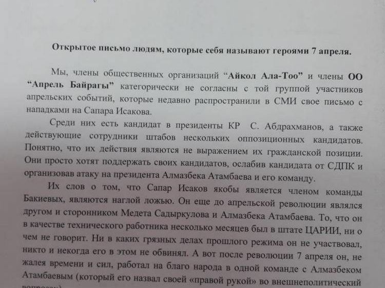 Биз алардын бул аракеттерин Алмазбек Атамбаевге каршы саясый чабуул катары эсептейбиз. Бул апрель окуяларынын көпчүлүгүнүн ой-пикирин билдирбейт. Сапар Исаков өзүн эмгекчил, акылдуу жана таза жетекчи катары көрсөтө алды. Биз анын мындан ары ишине ийгилик каалайбыз.