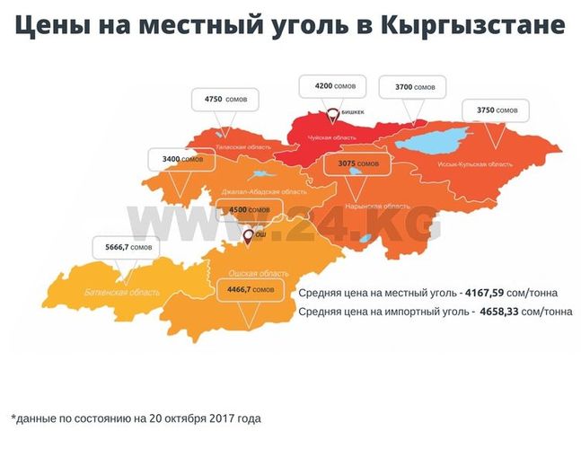 20-октябрга карата жергиликтүү көмүрдүн орточо баасы 4 миң 167, 59 сом, импорттуку 4 миң 658, 33 сом болду.
