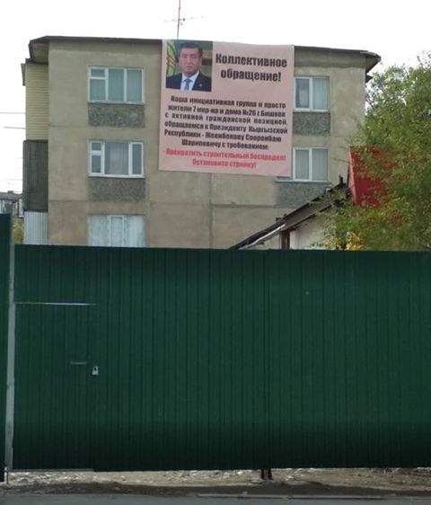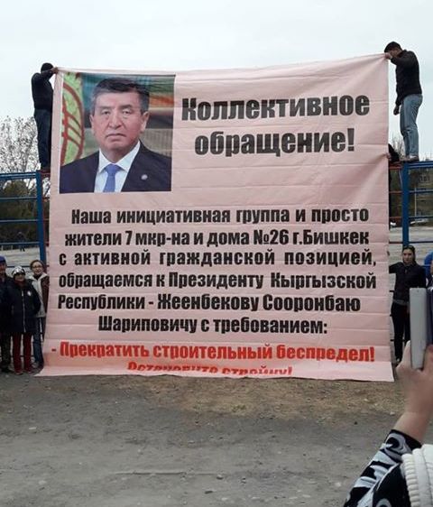 7-кичи райондун жашоочулары президентке кайрылышып, көп кабаттуу үйлөрдүн курулушун токтотууну суранышты. Алар жазуу жазылган баннерлерди № 26 үйгө асып коюшкан.