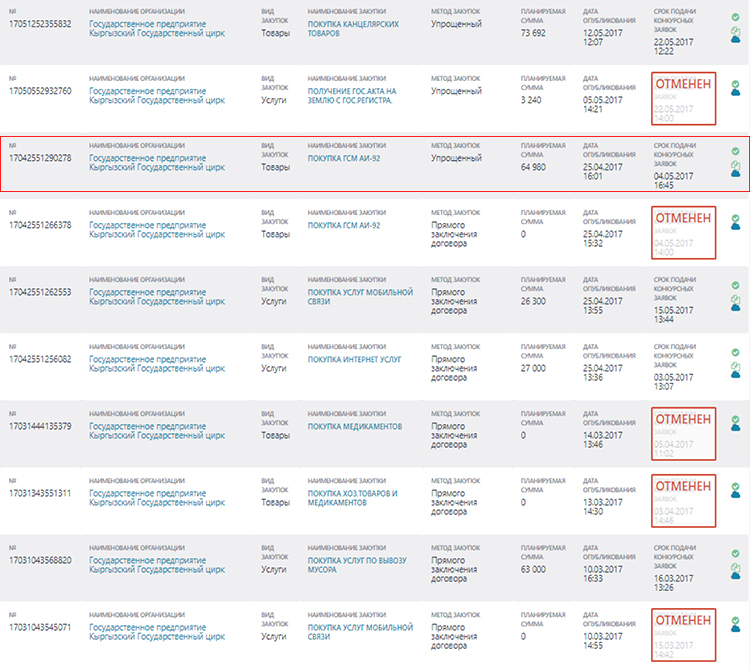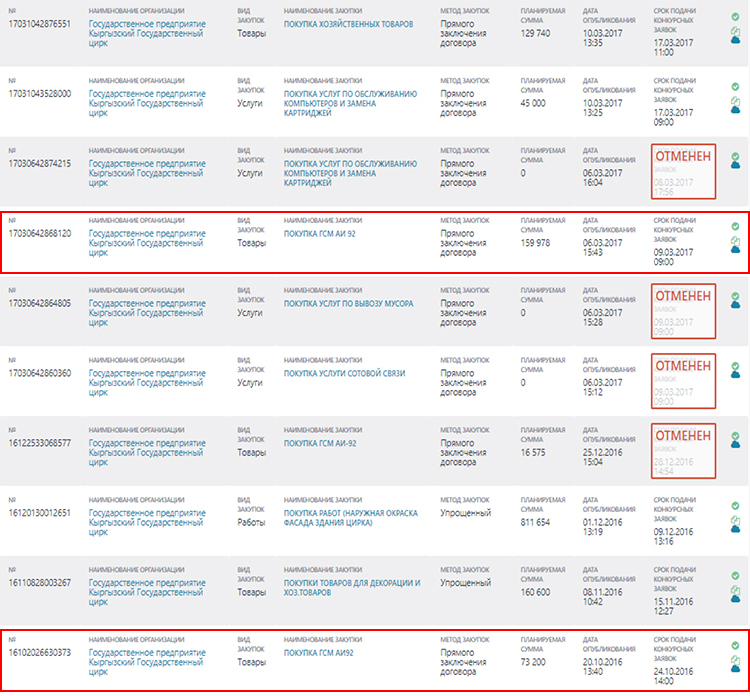 По словам сотрудников цирка, на балансе нет автомашины. При этом, по данным сайта госзакупок, с июля 2016 года бензин АИ-92 и АИ-95 закуплен на 832 тысячи 387 сомов.