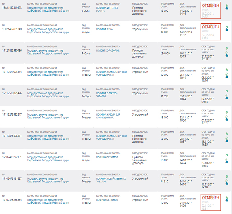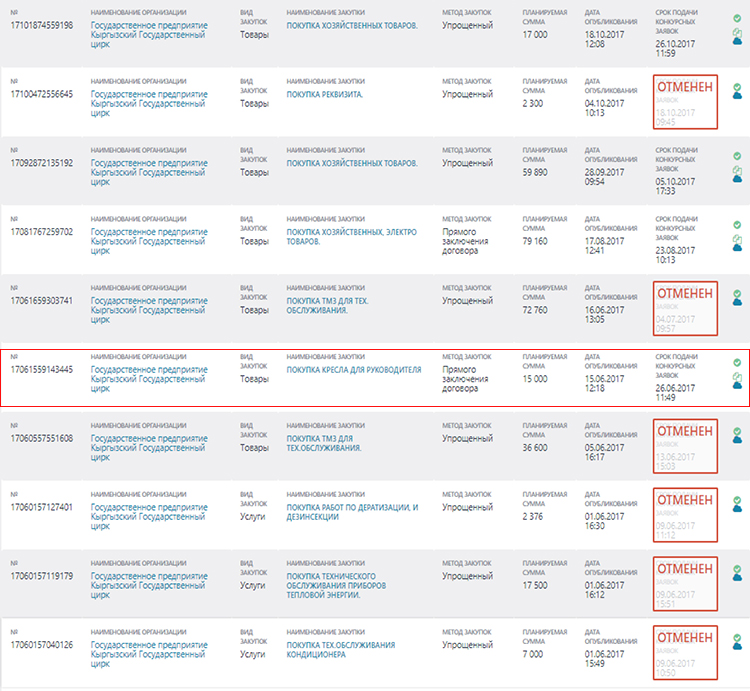 В 2016 году цирк приобрел три холодильника по 19 тысяч сомов и два новых кресла за 15 тысяч.