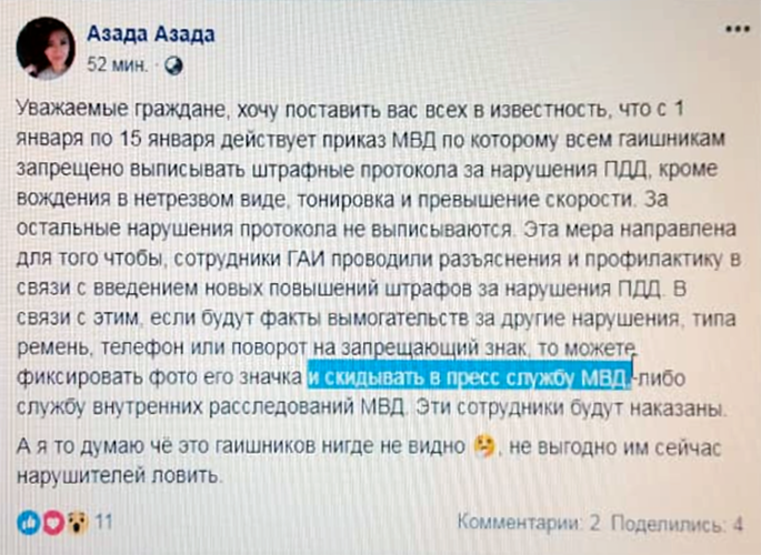 Пользователь под ником Азада написала, что эта мера направлена на то, чтобы работники УОБДД проводили разъяснения и профилактику после введения новых штрафов за нарушения ПДД.