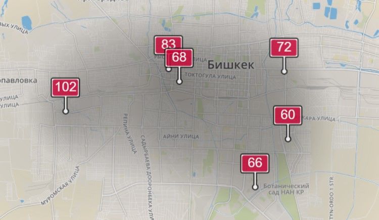 2. В районе улиц Бейшеналиевой/Токтогула. Уровень загрязнения превышен в 3,25 раза: PM2.5 среднесуточный — 114 мкг/м³, на момент измерения — 83 мкг/м³.