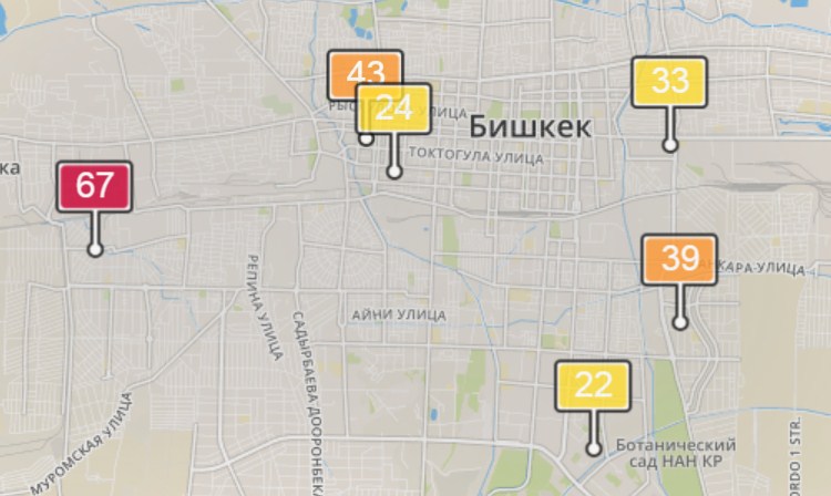 2. В районе улиц Бейшеналиевой/Токтогула. Уровень загрязнения превышен в 1,34 раза: PM2.5 среднесуточный — 47 мкг/м³, на момент измерения — 43 мкг/м³.