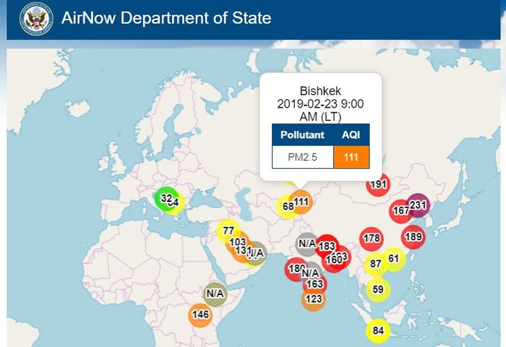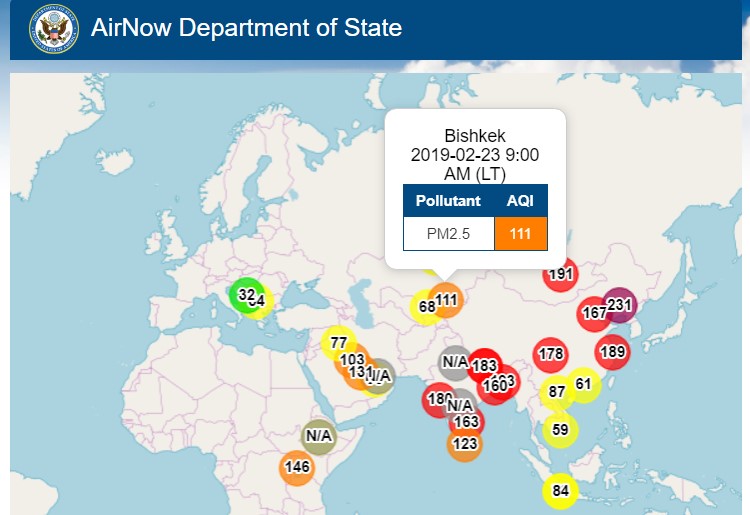 Посольство США в Кыргызстане также установило датчик, измеряющий уровень загрязнения воздуха. Информация обновляется ежечасно.