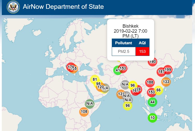 Посольство США в Кыргызстане также установило датчик, измеряющий уровень загрязнения воздуха. Информация обновляется ежечасно.