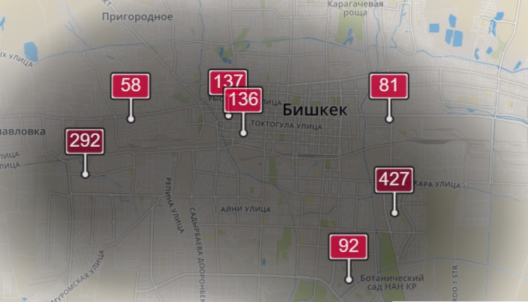 Общественное объединение MoveGreen и активист из Алматы Павел Александров собрали для Бишкека датчики и привязали их к карте.Для подсчета уровня загрязнения берут среднесуточные показатели. На карте также отмечен уровень загрязнения в режиме онлайн.
