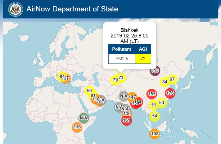Посольство США в Кыргызстане также установило датчик, измеряющий уровень загрязнения воздуха. Информация обновляется ежечасно.
