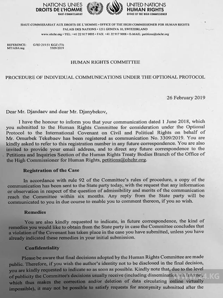 Комитет ООН по защите прав человека зарегистрировал обращение адвокатов лидера политической партии «Ата Мекен» Омурбека Текебаева. Отметим, что интересы политика сейчас представляют юристы правовой клиники «Адилет».
