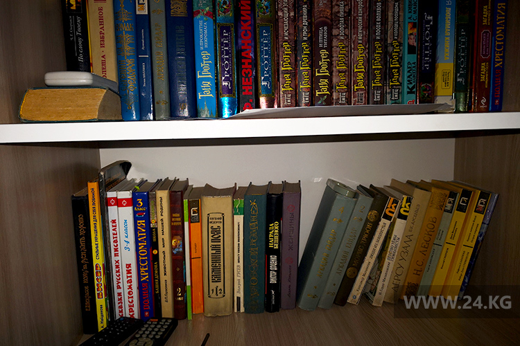 Девушка держит в руках книгу с произведениями Александра Беляева. «Я люблю читать. Больше всего мне нравится эпос «Манас». К сожалению, у нас нет этой книги, читаю в интернете. Мне очень нравится момент встречи Манаса с Каныкей. Как-то приснилось, что Саякбай Каралаев читает «Манаса», — рассказала она.