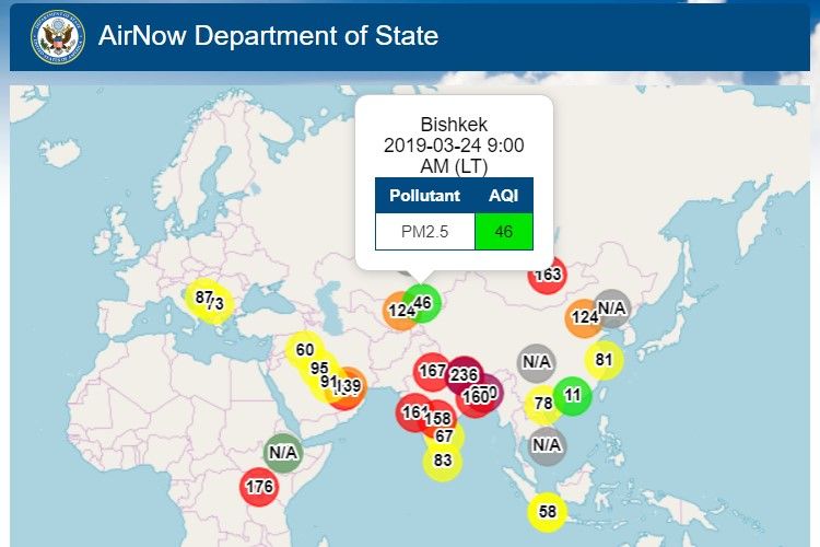Посольство США в Кыргызстане также установило датчик, измеряющий уровень загрязнения воздуха. Информация обновляется ежечасно.