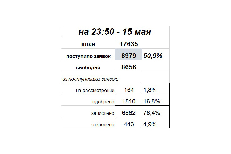Всего поступило 8 тысяч 979 заявок. Одобрены еще 1 тысяча 510 заявок, на рассмотрении — 164, отклонены по разным причинам 443.