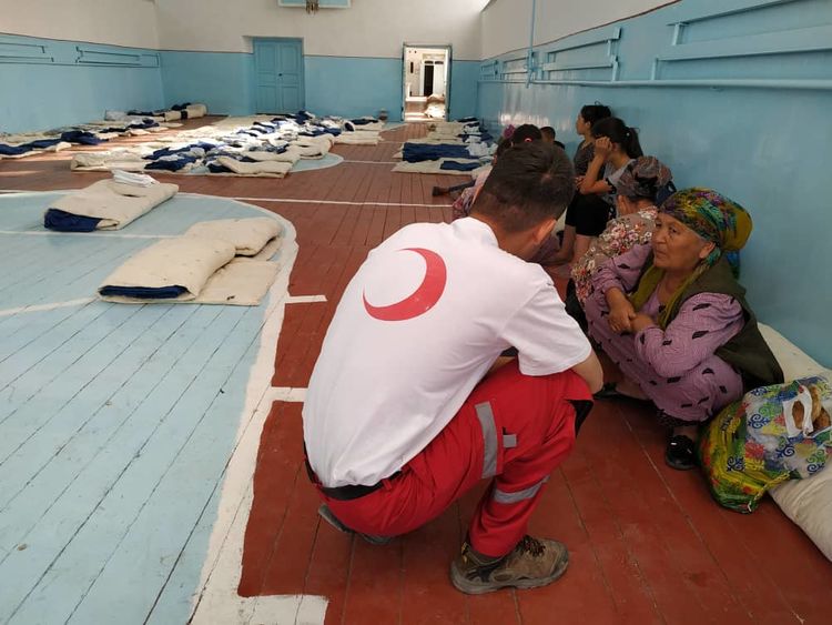 Сегодня Красный Полумесяц Кыргызстана раздает бутилированную воду и оказывает психосоциальную поддержку семьям в пяти приютах для эвакуированных.
