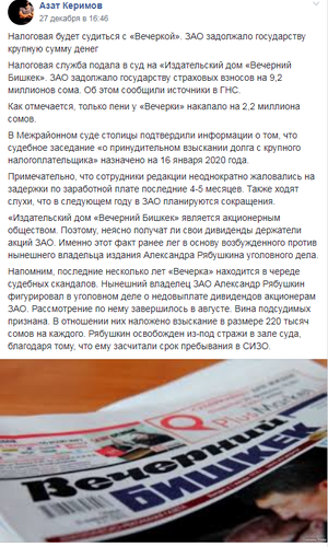 О том, что Налоговая служба будет судиться с «Вечеркой», стало известно 27 декабря из публикации некоего Азата Керимова в Facebook. Однако до сегодняшнего дня никто из соответствующих органов не подтверждал информацию.