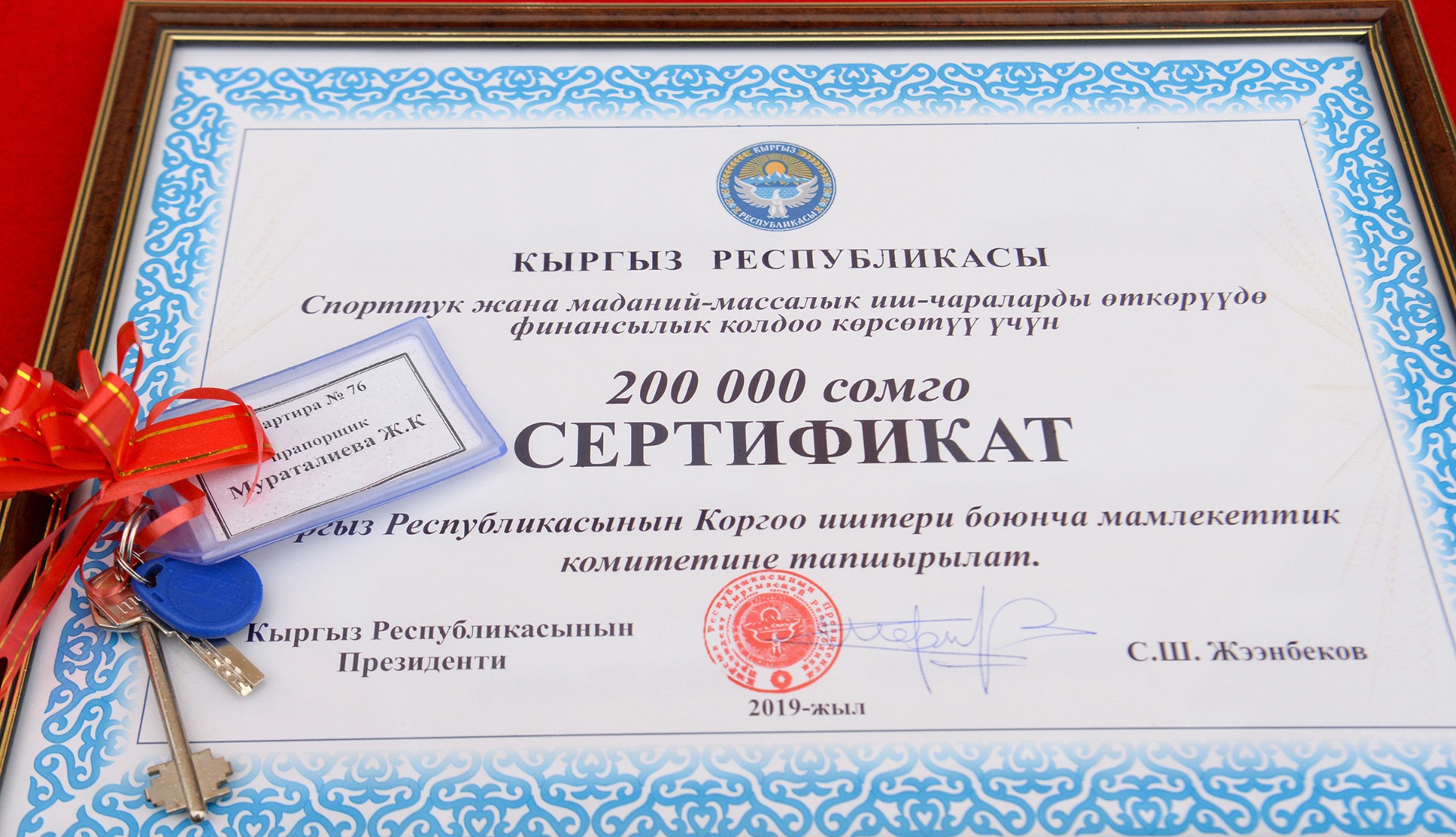 Глава государства также вручил сертификаты на 200 тысяч сомов для благоустройства каждого нового дома.