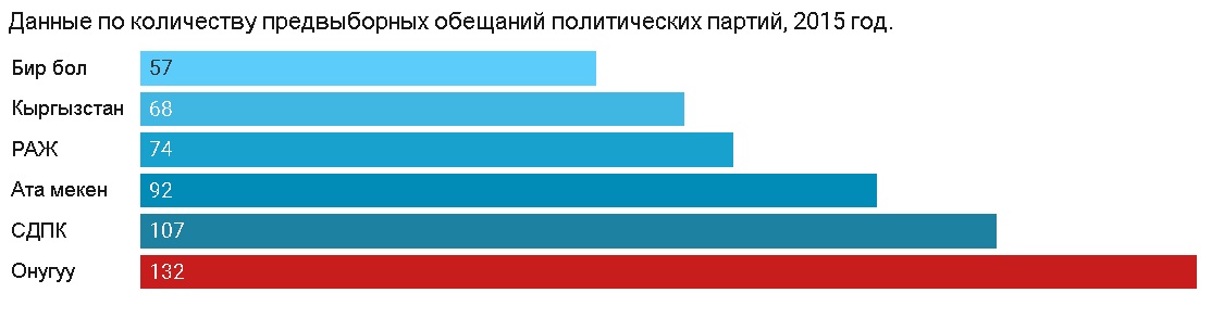 По данным ресурса, лидером по количеству обещаний в предвыборный период стала партия «Онугуу-Прогресс». За время агитационного периода кандидаты в депутаты парламента от партии успели раздать 132 обещания. Следом идут СДПК (107), «Ата Мекен» (92) и «Республика — Ата Журт» (74). Меньше всего дали обещения избирателям партии «Кыргызстан» (68) и «Бир Бол» (57).
