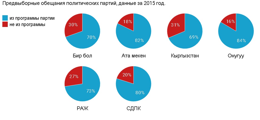 Отдалились от предвыборной платформы и партии «Республика — Ата Журт» и СДПК — 27 и 20 процентов. Несмотря на большое количество данных избирателям обещаний, максимально старались придерживаться политической предвыборной платформы «Ата Мекен» (18 процентов) и «Онугуу-Прогресс» (16 процентов).