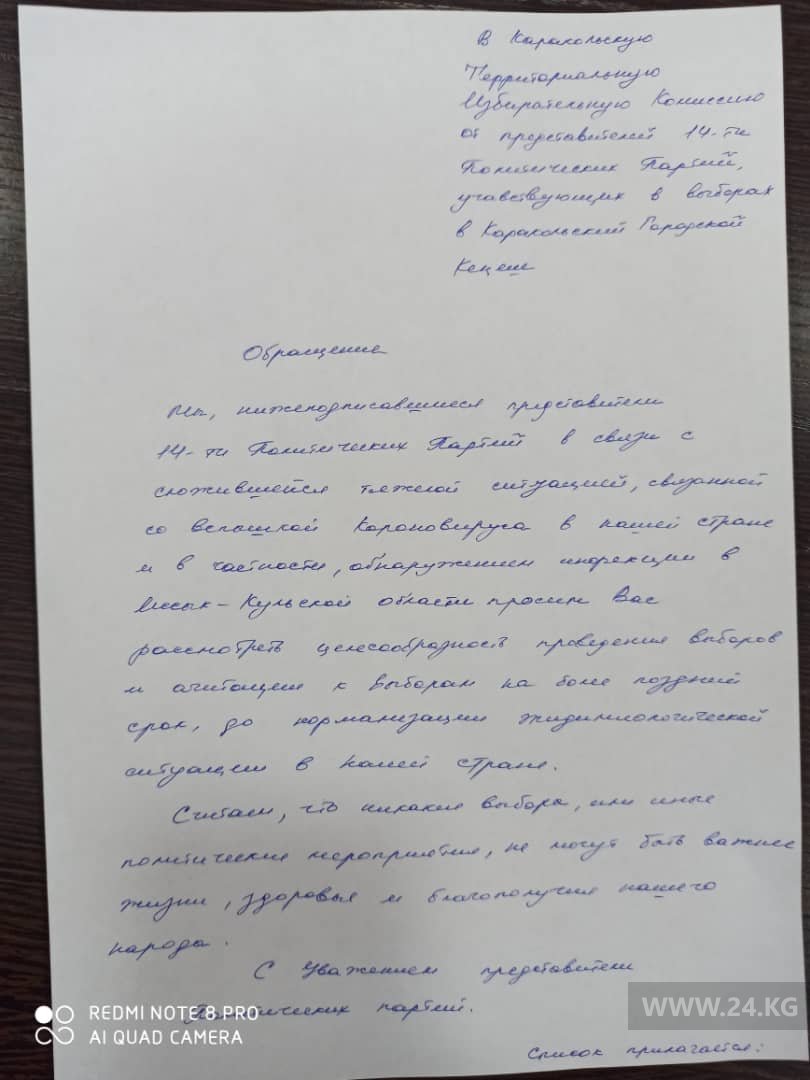 В территориальную избирательную комиссию Каракола обратились представители 14 политических партий с просьбой перенести местные выборы, которые, согласно указу президента, должны пройти 12 апреля.