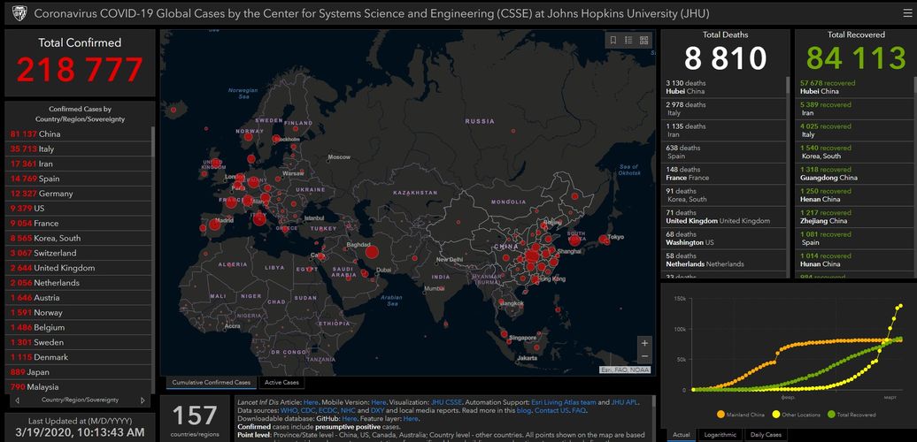 На сегодня в мире зафиксировали 218 тысяч 777 случаев заражения коронавирусом в 157 странах мира. В Китае — 81 тысяча 137. Много зараженных также в Италии (35 тысяч 713), Иране (17 тысяч 361), Испании (14 тысяч 769), Германии (12 тысяч 327), США (9 тысяч 379) и Франции (9 тысяч 54).