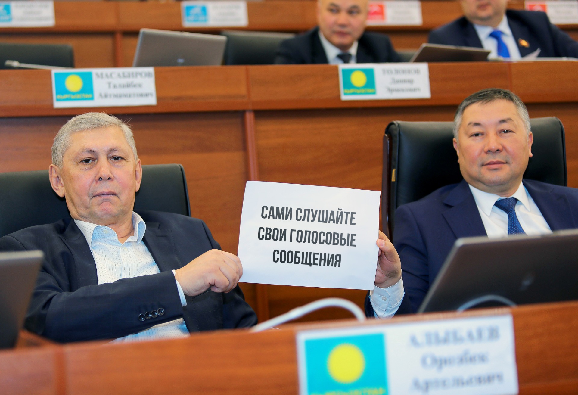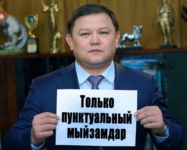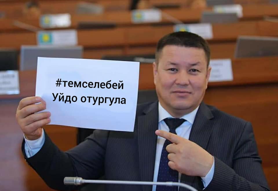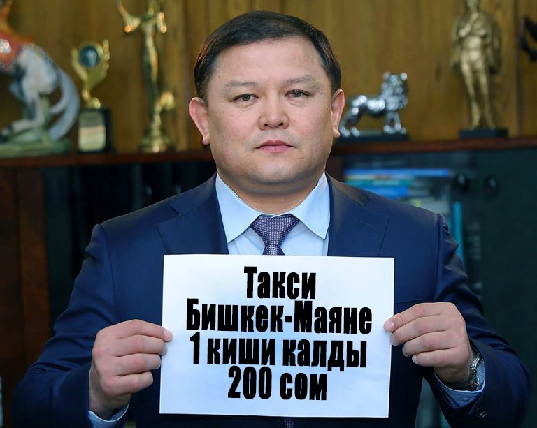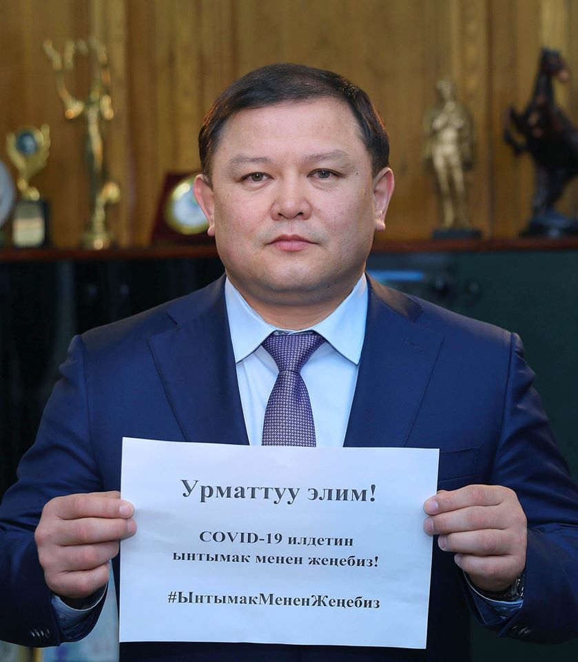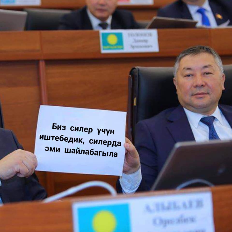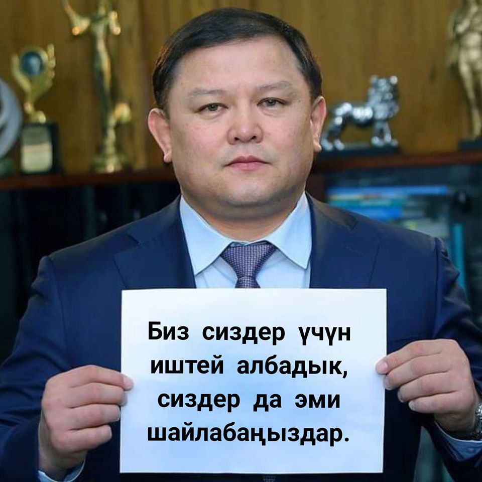 Однако пальма первенства досталась спикеру парламента Дастанбеку Джумабекову. Торага решил не отставать от своих коллег и поддержал акцию. Он сфотографировался не в зале заседания, а очевидно, в своем кабинете. Снимок быстро разлетелся по соцсетям, а креативные кыргызстанцы, применив фотошоп, заменили лозунг забавными шуточными надписями.